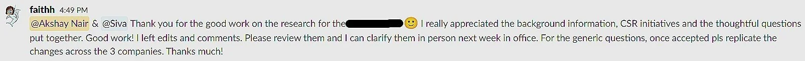 An example of a Slack message that my supervisor, Faith, sent after reviewing a research document that a fellow intern, Siva, and I had put together. The research topic has been covered for sensitivity reasons.